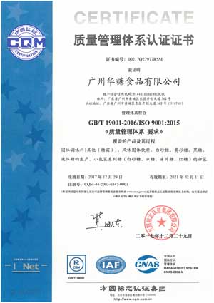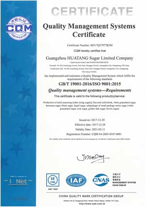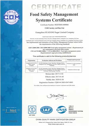 Guangzhou HUATANG Co., Ltd. is equipped with Technology R&D Center that combines market with product development and provides strong technical support for product development and production. The sugar manufacturing technical indicators are in the lead in China with the white granulated sugar product quality being superior to the national standard. Besides, it is the first to adopt quality control systems such as ISO, HACCP and GMP. The products were in the first batch to be granted as a Guangzhou Famous Trademark, and successively won the gold medal in Beijing, Shanghai International Fair. In 2003, the products were awarded the title of Guangdong Well-known Brand and Guangdong Famous Trademark. From 2001 to 2018, they have assessed as quality -reliable products by the State Quality Supervision and Inspection Center for several times, ranking top for three consecutive years. The company has been evaluated as a "credible contract-honoring" enterprise by Guangzhou Administrative Bureau of Industry and Commerce for years in a row.