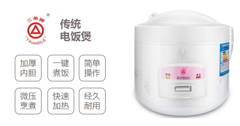 “三角”牌始于1963年,主要生产电饭锅,远销东南亚,久负盛名。50年来, “三角”牌凭借经典工艺、不懈创新,一直致力于为消费者提供可靠、实惠的电器产品,从最初的电饭锅延伸至所有厨房家电及其他生活电器,从只出口海外,到畅销国内。时至今日,“三角”牌产品覆盖从电饭锅等小家电到冰箱洗衣机等大家电,年产销量超1000万台,部分产品全国市场销量稳居前列,成为中国驰名商标、广州市著名商标、广州老字号。